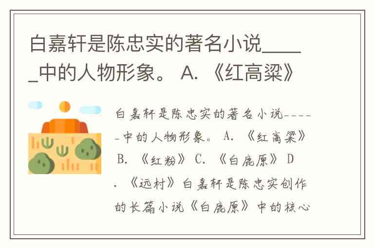 白嘉轩作为白鹿村白氏家族的族长,是传统文化秩序的坚定维护者,其形象贯穿小说始终,承载了作者对传统文化、道德伦理与历史变迁的深刻思考。其他选项中,《红高粱》是莫言作品,《红粉》作者为苏童,《远村》则出自贾平凹之手,均与白嘉轩这一人物无关。当文学人物与特定作品紧密相连时,这种对应关系往往成为理解作家创作意图的重要钥匙——你还能想到哪些像白嘉轩这样与特定文学作品密不可分的经典人物?