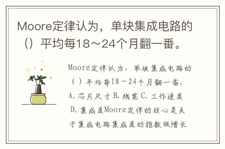 Moore定律认为,单块集成电路的()平均每18~24个月翻一番。A.芯片尺寸 B.线宽 C.工作速度 D.集成度