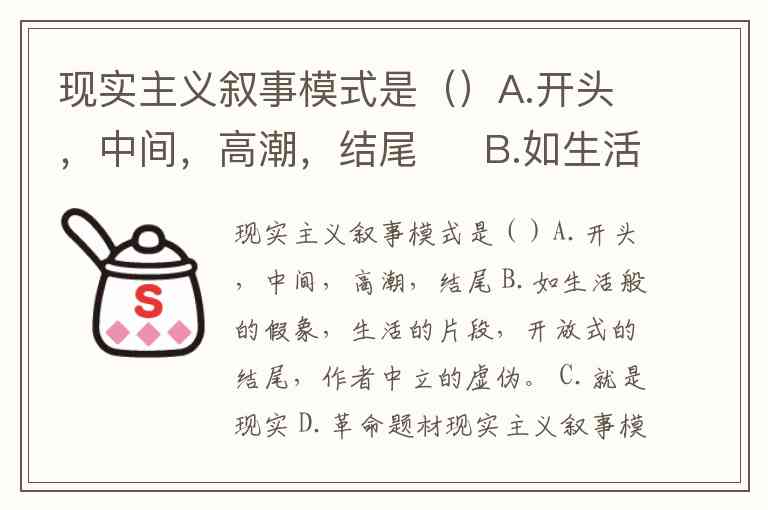 现实主义叙事模式是()A.开头,中间,高潮,结尾 B.如生活般的假象,生活的片段,开放式的结尾,作者中立的虚伪。 C.就是现实 D.革命题材
