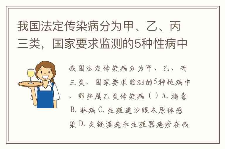 我国法定传染病分为甲、乙、丙三类,国家要求监测的5种性病中,那些属乙类传染病()A.梅毒 B.淋病 C.生殖道沙眼衣原体感染 D.尖锐湿疣和生殖器疱疹