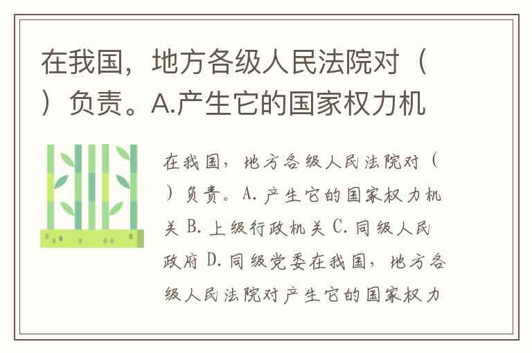 在我国,地方各级人民法院对产生它的国家权力机关负责,正确答案为 A。这一制度设计源于我国根本政治制度——人民代表大会制度,体现了审判机关由权力机关产生、对其负责的宪法原则。