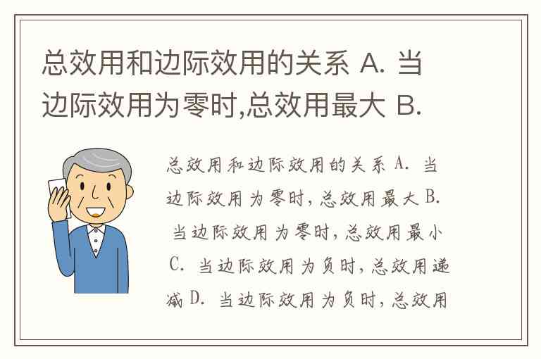 总效用和边际效用的关系 A. 当边际效用为零时,总效用最大 B. 当边际效用为零时,总效用最小 C. 当边际效用为负时,总效用递减 D. 当边际效用为负时,总效用递增 E. 当边际效用为正时,总效用递增