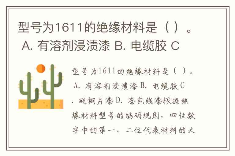 型号为1611的绝缘材料是( )。 A. 有溶剂浸渍漆 B. 电缆胶 C. 硅钢片漆 D. 漆包线漆