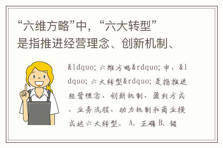 “六维方略”中,“六大转型”是指推进经营理念、创新机制、盈利方式、业务流程、动力机制和商业模式这六大转型。 A. 正确 B. 错误