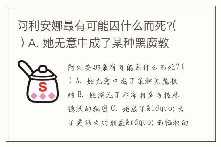 阿利安娜最有可能因什么而死?( ) A. 她无意中成了某种黑魔教的 B. 她撞见了邓布利多与格林德沃的秘密 C. 她成了“为了更伟大的利益”而牺牲的第一人 D. 她成了格林德沃邪门试验的