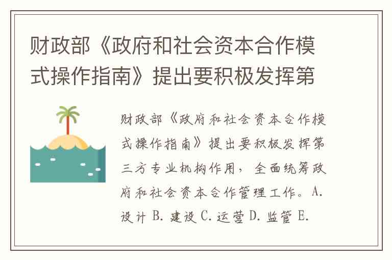 财政部《政府和社会资本合作模式操作指南》提出发挥第三方专业机构作用,核心在于通过专业力量提升PPP项目全生命周期管理水平。从文档信息看,第三方机构的统筹作用贯穿项目设计、监管等关键环节,具体涵盖规划指导、识别评估、绩效评价等职能。