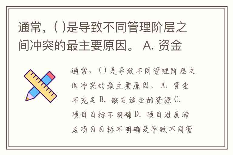 通常,( )是导致不同管理阶层之间冲突的最主要原因。 A. 资金不充足 B. 缺乏适合的资源 C. 项目目标不明确 D. 项目进度滞后
