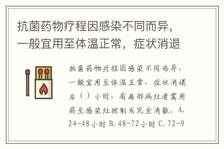 抗菌药物疗程因感染不同而异,一般宜用至体温正常,症状消退后()小时,有局部病灶者需用药至感染灶控制或完全消散。A.24-48小时 B.48-72小时 C.72-96小时 D.36-48小时