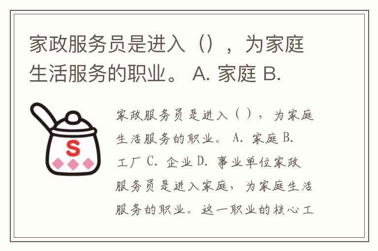 家政服务员是进入(),为家庭生活服务的职业。 A. 家庭 B. 工厂 C. 企业 D. 事业单位