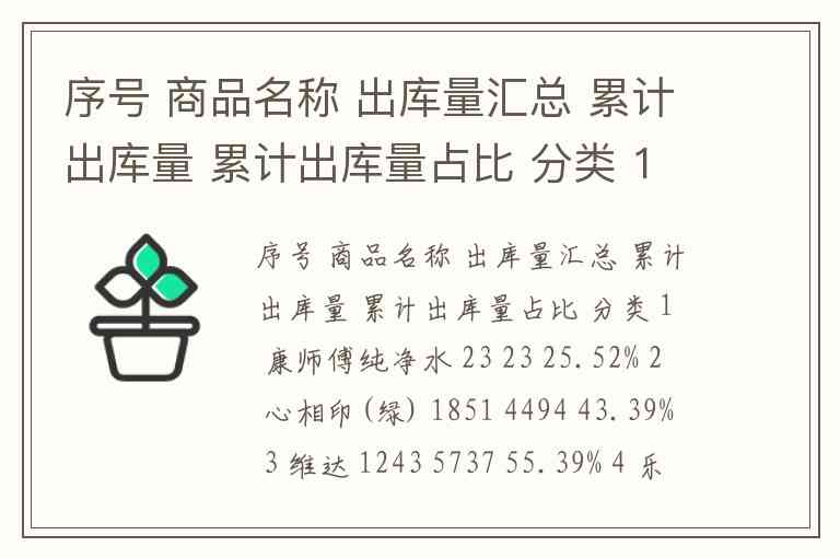 序号 商品名称 出库量汇总 累计出库量 累计出库量占比 分类 1 康师傅纯净水 23 23 25.52% 2 心相印(绿) 1851 4494 43.39% 3 维达 1243 5737 55.39% 4 乐百氏饮用矿物质水 1180 66.78% 5 脉动维生素饮料 1132 8049 B 类 6 五月花卷筒纸 1038 87.73% 7 达利园岩层矿物质水 613 9700 93.65% C 类 8 幸福时光卷筒纸 232 9932 95.89% 9 心相印(蓝) 219 10151 98.00% 10 纯悦饮用矿泉水 207 100.00%