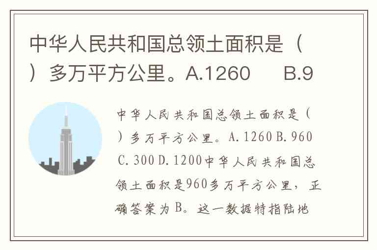中华人民共和国总领土面积是()多万平方公里。A.1260 B.960 C.300 D.1200