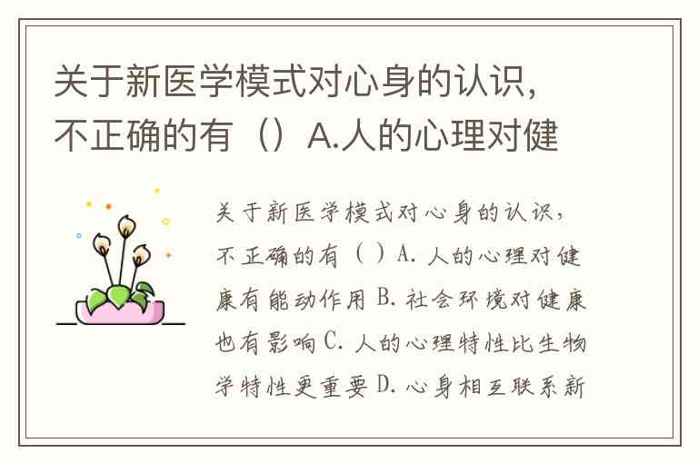 关于新医学模式对心身的认识,不正确的有()A.人的心理对健康有能动作用 B.社会环境对健康也有影响 C.人的心理特性比生物学特性更重要 D.心身相互联系