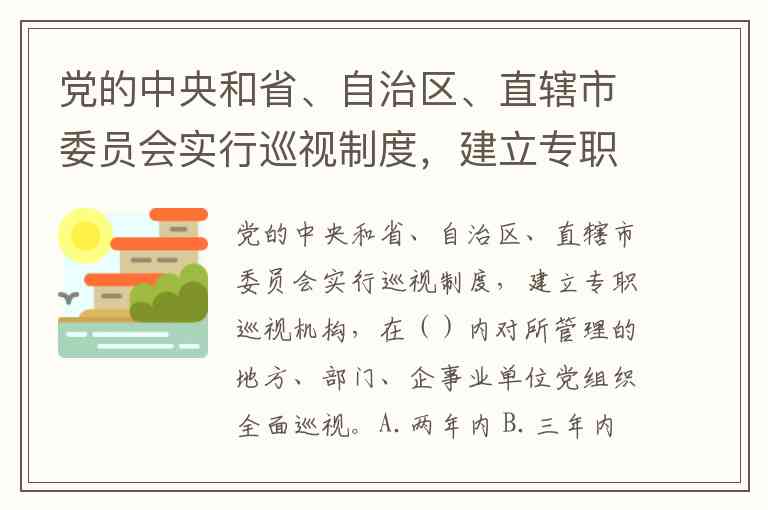党的中央和省、自治区、直辖市委员会实行巡视制度,建立专职巡视机构,在()内对所管理的地方、部门、企事业单位党组织全面巡视。A.两年内 B.三年内 C.四年内 D.一届任期