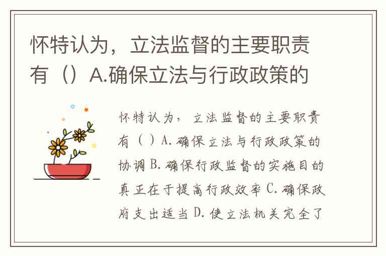 怀特认为,立法监督的主要职责有()A.确保立法与行政政策的协调 B.确保行政监督的实施目的真正在于提高行政效率 C.确保政府支出适当 D.使立法机关完全了解行政情形,以便制定补救的立法