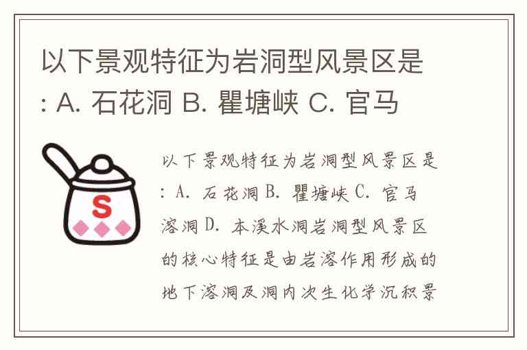 以下景观特征为岩洞型风景区是: A. 石花洞 B. 瞿塘峡 C. 官马溶洞 D. 本溪水洞