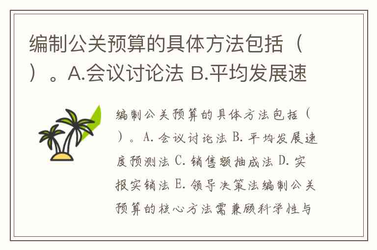 编制公关预算的具体方法包括()。A.会议讨论法 B.平均发展速度预测法 C.销售额抽成法 D.实报实销法 E.领导决策法