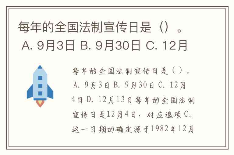 每年的全国法制宣传日是()。 A. 9月3日 B. 9月30日 C. 12月4日 D. 12月13日