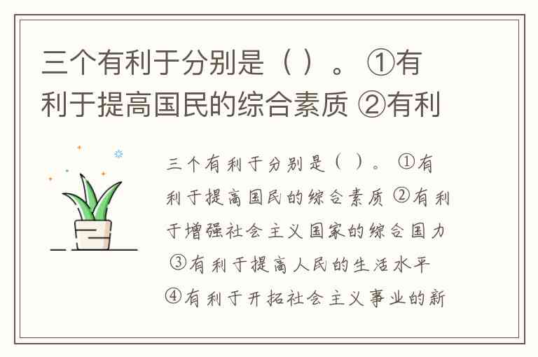 三个有利于分别是( )。 ①有利于提高国民的综合素质 ②有利于增强社会主义国家的综合国力 ③有利于提高人民的生活水平 ④有利于开拓社会主义事业的新局面 ⑤有利于发展社会主义生产力 A. ②④⑤ B. ①③⑤ C. ②③⑤ D. ①③④