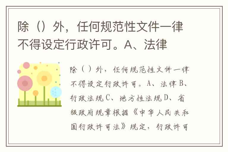 除()外,任何规范性文件一律不得设定行政许可。A、法律 B、行政法规 C、地方性法规 D、省级政府规章
