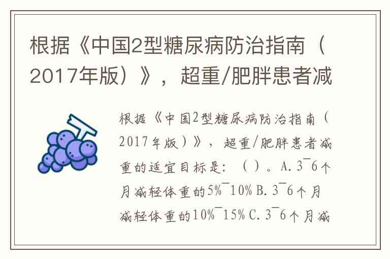 根据《中国2型糖尿病防治指南(2017年版)》,超重/肥胖患者减重的适宜目标是:()。A.3~6个月减轻体重的5%~10% B.3~6个月减轻体重的10%~15% C.3~6个月减轻体重的5kg~10kg D.3~6个月减轻体重的10kg~15kg