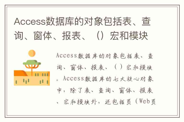 Access数据库的七大核心对象中,除了表、查询、窗体、报表、宏和模块外,还包括页(Web页)。这一对象用于创建与数据库数据交互的网页,支持通过浏览器访问和操作数据,是早期Access中实现Web数据共享的重要方式。尽管在新版本中其功能已部分被其他工具替代,但作为历史完整对象模型的组成部分,页仍是标准答案中不可或缺的一环。数据库设计时需根据实际需求选择合适对象组合,现代应用中,开发者常以查询、窗体与报表为核心构建数据管理系统。