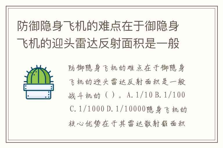 防御隐身飞机的难点在于御隐身飞机的迎头雷达反射面积是一般战斗机的()。A.1/10 B.1/100 C.1/1000 D.1/10000
