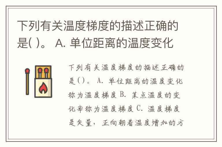 下列有关温度梯度的描述正确的是( )。 A. 单位距离的温度变化称为温度梯度 B. 某点温度的变化率称为温度梯度 C. 温度梯度是矢量,正向朝着温度增加的方向 D. 温度梯度是矢量,正向朝着温度减少的方向