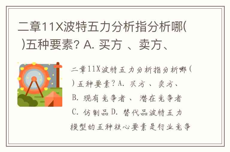 二章11X波特五力分析指分析哪( )五种要素? A. 买方 、卖方、 B. 现有竞争者 、 潜在竞争者 C. 仿制品 D. 替代品