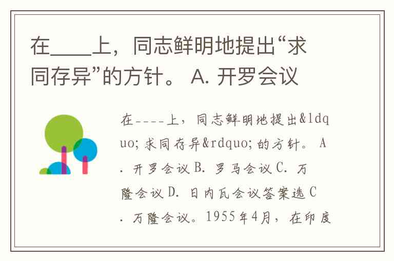 在____上,同志鲜明地提出“求同存异”的方针。 A. 开罗会议 B. 罗马会议 C. 万隆会议 D. 日内瓦会议