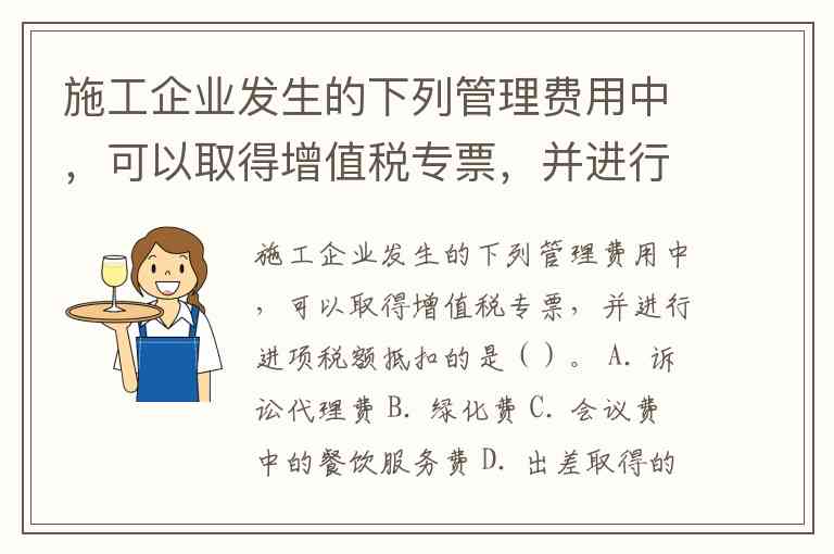 施工企业发生的下列管理费用中,可以取得增值税专票,并进行进项税额抵扣的是()。 A. 诉讼代理费 B. 绿化费 C. 会议费中的餐饮服务费 D. 出差取得的汽车票、火车票和飞机票