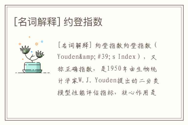 约登指数(Youden's Index),又称正确指数,是1950年由生物统计学家W.J. Youden提出的二分类模型性能评估指标,核心作用是综合衡量模型对正负样本的识别能力。它通过整合灵敏度(Sensitivity)和特异度(Specificity)两个关键参数,计算公式为 约登指数 = 灵敏度 + 特异度 - 1。其中,灵敏度(真正率)表示模型正确识别阳性样本的比例(如疾病患者),特异度表示正确识别阴性样本的比例(如健康人群)。