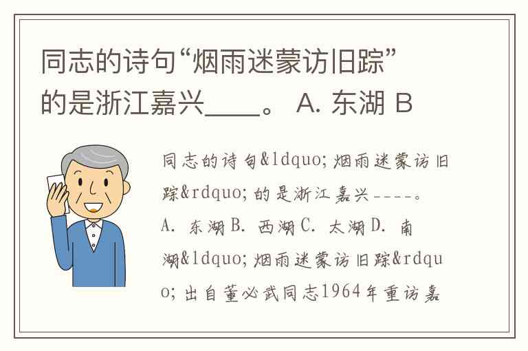 同志的诗句“烟雨迷蒙访旧踪”的是浙江嘉兴____。 A. 东湖 B. 西湖 C. 太湖 D. 南湖