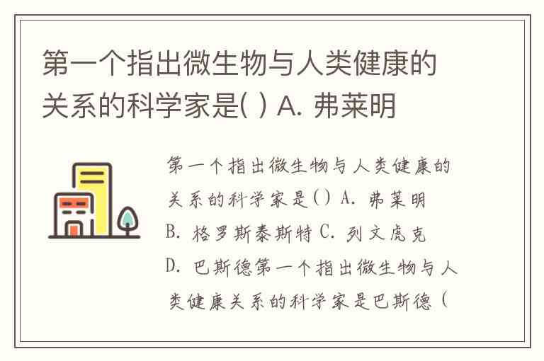 第一个指出微生物与人类健康的关系的科学家是( ) A. 弗莱明 B. 格罗斯泰斯特 C. 列文虎克 D. 巴斯德