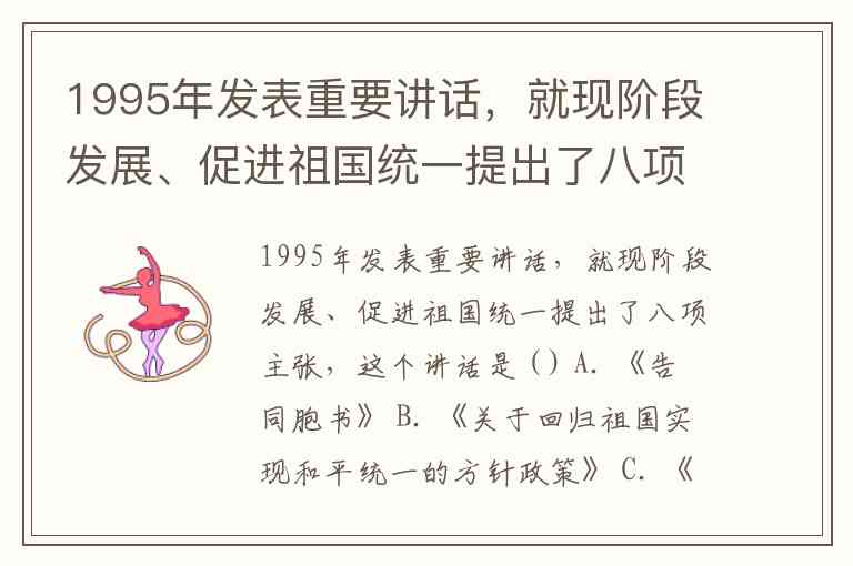 1995年发表重要讲话,就现阶段发展、促进祖国统一提出了八项主张,这个讲话是 ( ) A. 《告同胞书》 B. 《关于回归祖国实现和平统一的方针政策》 C. 《的原则与问题》 D. 《为促进祖国统一大业的完成而继续奋斗》
