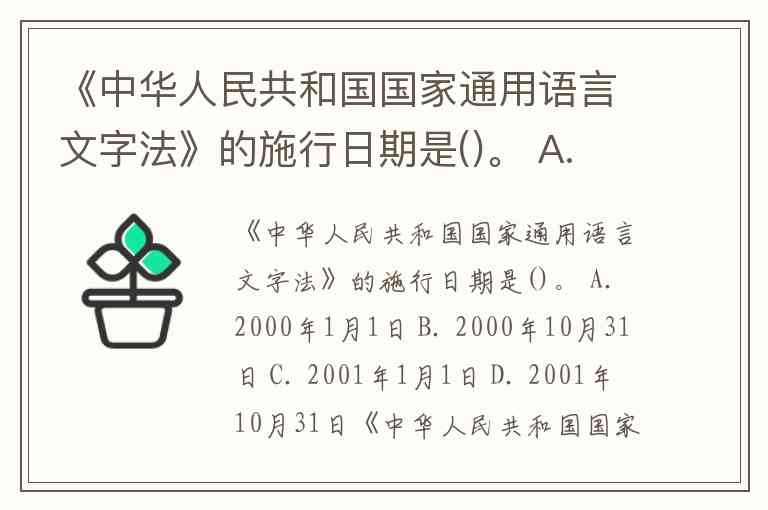《中华人民共和国国家通用语言文字法》的施行日期是()。 A. 2000年1月1日 B. 2000年10月31日 C. 2001年1月1日 D. 2001年10月31日