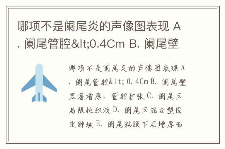 哪项不是阑尾炎的声像图表现 A. 阑尾管腔<0.4Cm B. 阑尾壁显著增厚,管腔扩张 C. 阑尾区局限性积液 D. 阑尾区混合型固定肿块 E. 阑尾粘膜下层增厚而不规则