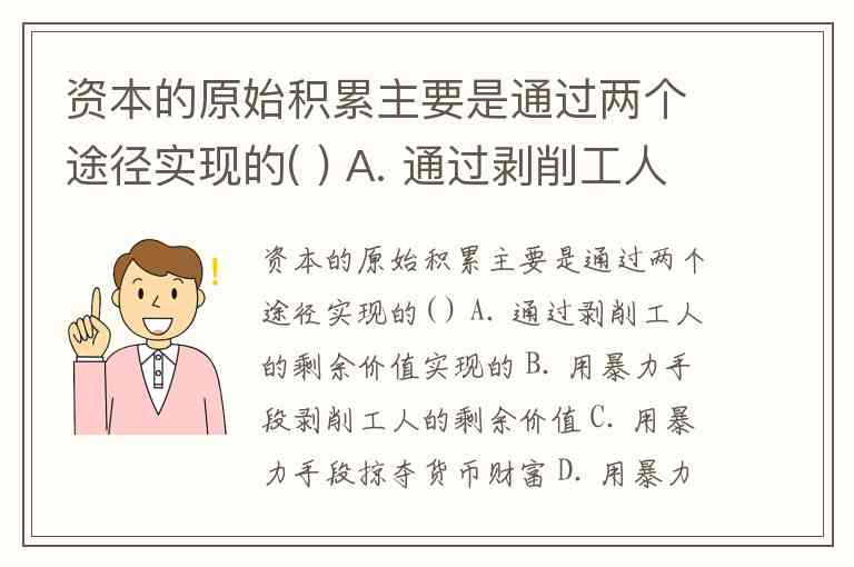 资本的原始积累主要是通过两个途径实现的( ) A. 通过剥削工人的剩余价值实现的 B. 用暴力手段剥削工人的剩余价值 C. 用暴力手段掠夺货币财富 D. 用暴力手段实现资本集中