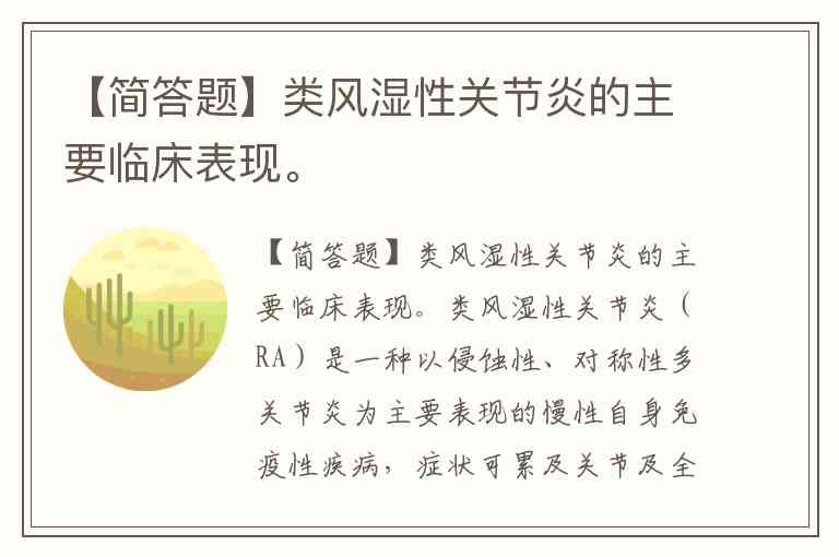 类风湿性关节炎(RA)是一种以侵蚀性、对称性多关节炎为主要表现的慢性自身免疫性疾病,症状可累及关节及全身多个系统。其核心特征是对称性外周小关节炎(如腕、掌指及近端指间关节),伴随晨僵、疼痛、肿胀及进行性关节破坏,同时常出现全身症状和关节外多器官受累。