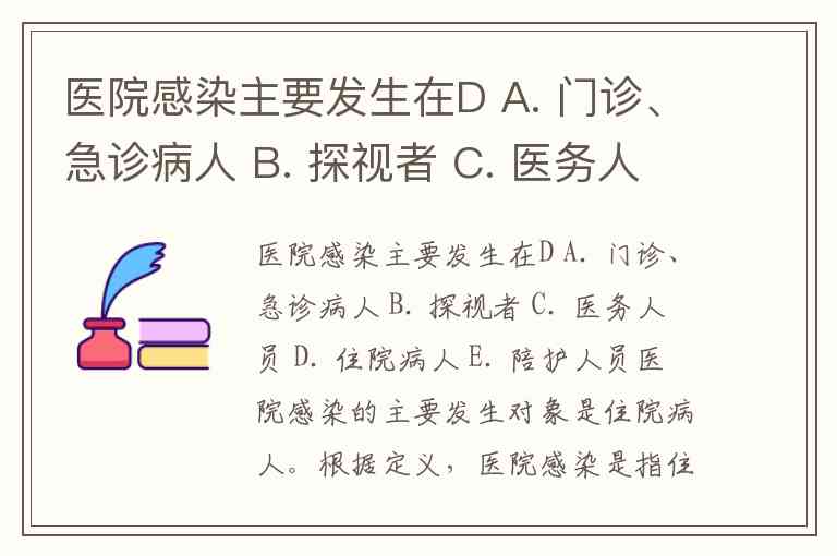 医院感染主要发生在D A. 门诊、急诊病人 B. 探视者 C. 医务人员 D. 住院病人 E. 陪护人员
