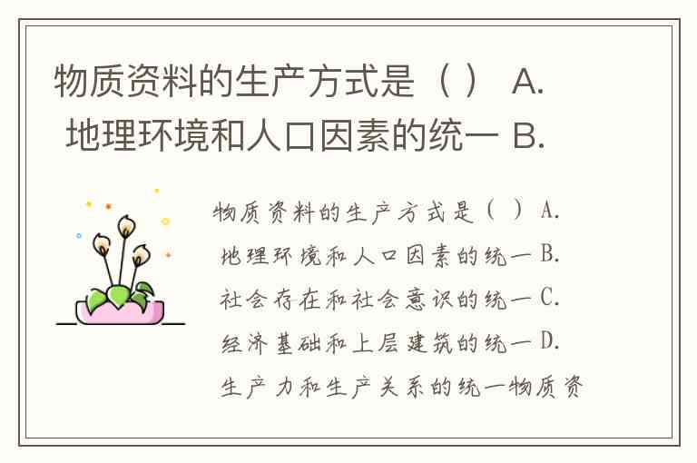 物质资料的生产方式是( ) A. 地理环境和人口因素的统一 B. 社会存在和社会意识的统一 C. 经济基础和上层建筑的统一 D. 生产力和生产关系的统一