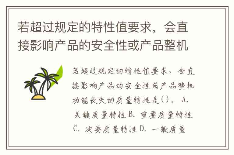 若超过规定的特性值要求,会直接影响产品的安全性或产品整机功能丧失的质量特性是( )。 A. 关键质量特性 B. 重要质量特性 C. 次要质量特性 D. 一般质量特性