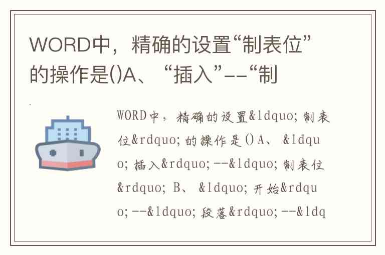 WORD中,精确的设置“制表位”的操作是()A、 “插入”--“制表位” B、 “开始”--“段落”--“制表位” C、 “格式”--“段落” D、 “格式”--“文字方向”