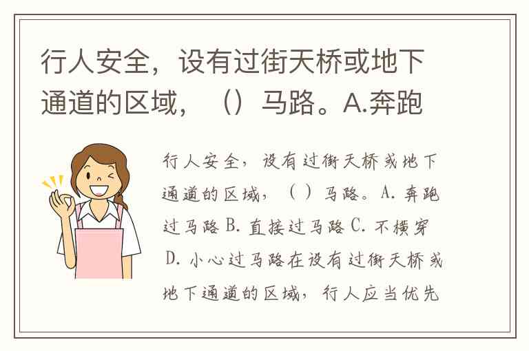 行人安全,设有过街天桥或地下通道的区域,()马路。A.奔跑过马路 B.直接过马路 C.不横穿 D.小心过马路