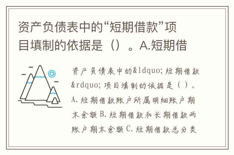资产负债表中的“短期借款”项目填制的依据是()。A.短期借款账户所属明细账户期末余额 B.短期借款和长期借款两账户期末余额 C.短期借款总分类账户期末余额 D.短期借款总分类账户期末余额和所属明细账户期末余额