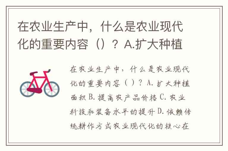 在农业生产中,什么是农业现代化的重要内容()?A.扩大种植面积 B.提高农产品价格 C.农业科技和装备水平的提升 D.依赖传统耕作方式