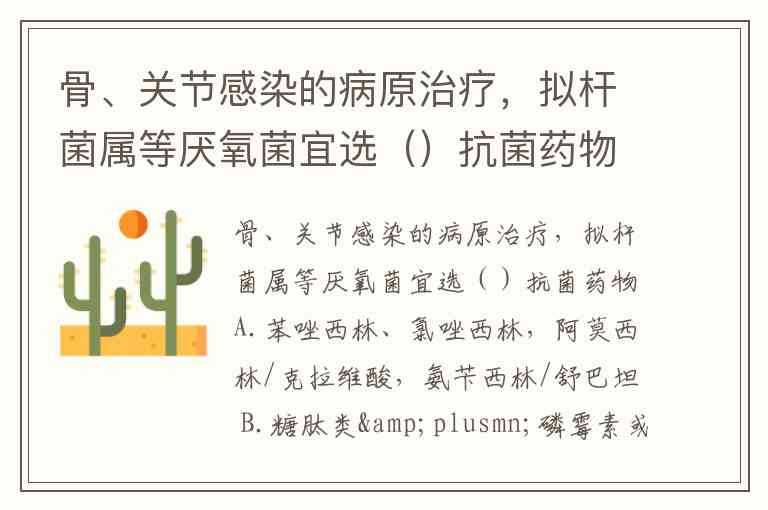骨、关节感染的病原治疗,拟杆菌属等厌氧菌宜选()抗菌药物A.苯唑西林、氯唑西林,阿莫西林/克拉维酸,氨苄西林/舒巴坦 B.糖肽类±磷霉素或利福平,利奈唑胺 C.环丙沙星或哌拉西林或抗铜绿假单胞菌头孢菌素+氨基糖苷类 D.甲硝唑