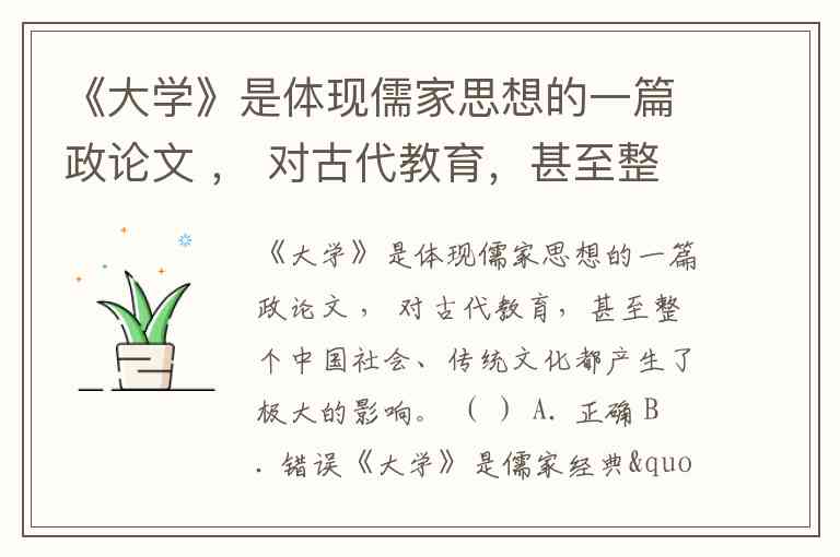 《大学》是体现儒家思想的一篇政论文 , 对古代教育,甚至整个中国社会、传统文化都产生了极大的影响。 ( ) A. 正确 B. 错误