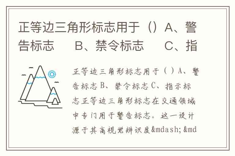 正等边三角形标志用于()A、警告标志 B、禁令标志 C、指示标志