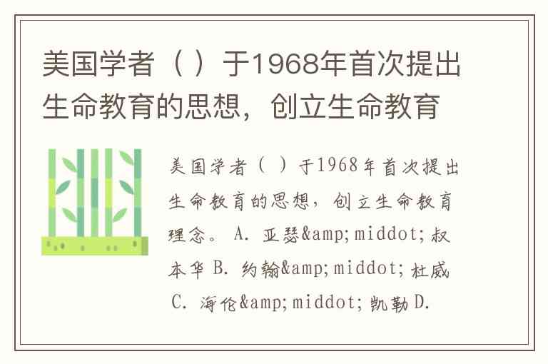 美国学者( )于1968年首次提出生命教育的思想,创立生命教育理念。 A. 亚瑟·叔本华 B. 约翰·杜威 C. 海伦·凯勒 D. 杰·华特士
