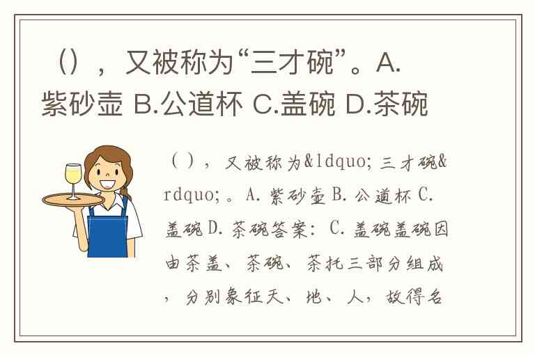 (),又被称为“三才碗”。A.紫砂壶 B.公道杯 C.盖碗 D.茶碗